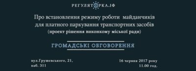 16 червня в 11 годині в кабінеті 311 виконавчого комітету Івано-Франківської міської ради відбудуться громадські обговорення проекту рішення “Про встановлення режиму роботи майданчиків для платного паркування транспортних засобів”, повідомляє СТИК.