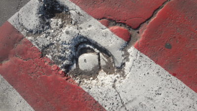 Примітно, що крізь діри, утворені у не так вже й давно укладеному за сучасними технологіями асфальті, “виглядає” добротна кам’яна бруківка, викладена, мабуть, понад століття тому.