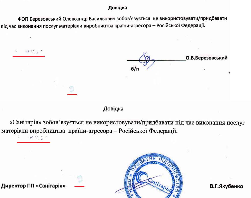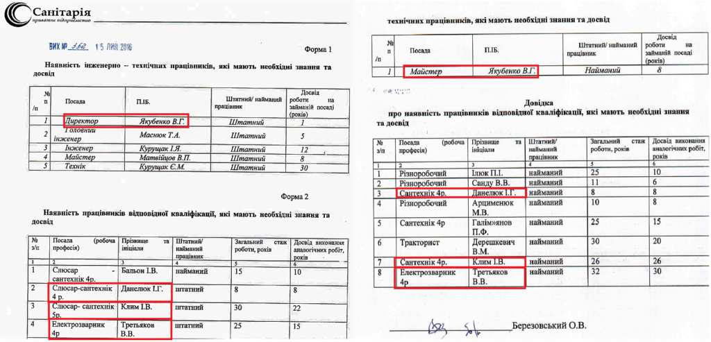 Інші довідки редакція перевірити не змогла, бо конкуренти завантажили їх як конфіденційні. Однак у довідках на інших торгах вони подавали спільних працівників. Наприклад, підприємець Березовський вказував директора «Санітарії» Віталія Якубенка своїм майстром.