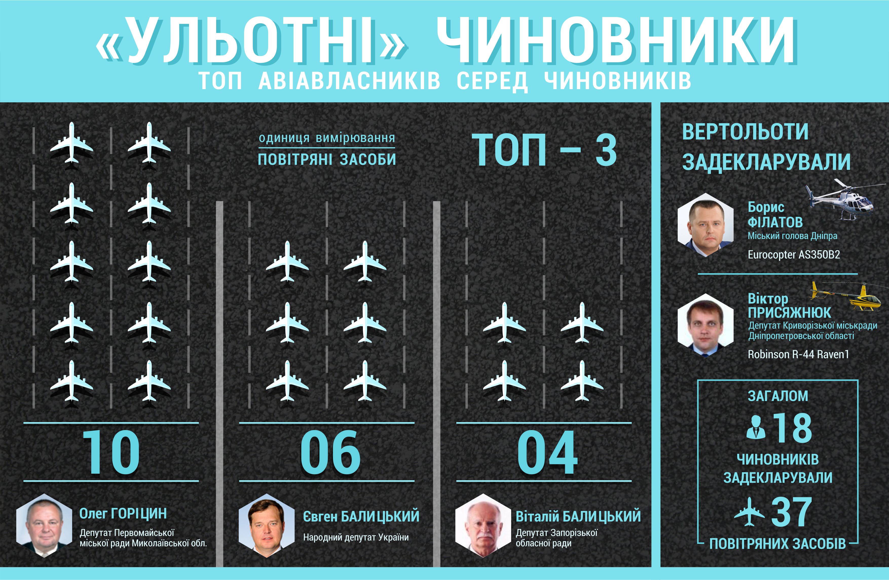 Більшість повітряних засобів, які декларують чиновники, – це легкі літаки, проте поруч із ними можна знайти навіть вертольоти. Їх в базі декларацій два. Перший – французький Eurocopter AS350B2 – належить міському голові Дніпра Борису Філатову. Другим – американським Robinson R-44 Raven1 – володіє депутат Криворізької міськради Віктор Присяжнюк.