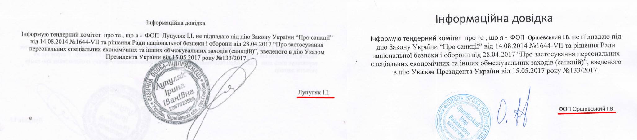 Обидва учасники надали однаково оформлені та аналогічні за змістом документи, хоча замовник вимагав їх у довільній формі, наприклад, довідка про застосування заходів із захисту довкілля чи про те, що учасник не підпадає під дію Закону України «Про санкції».