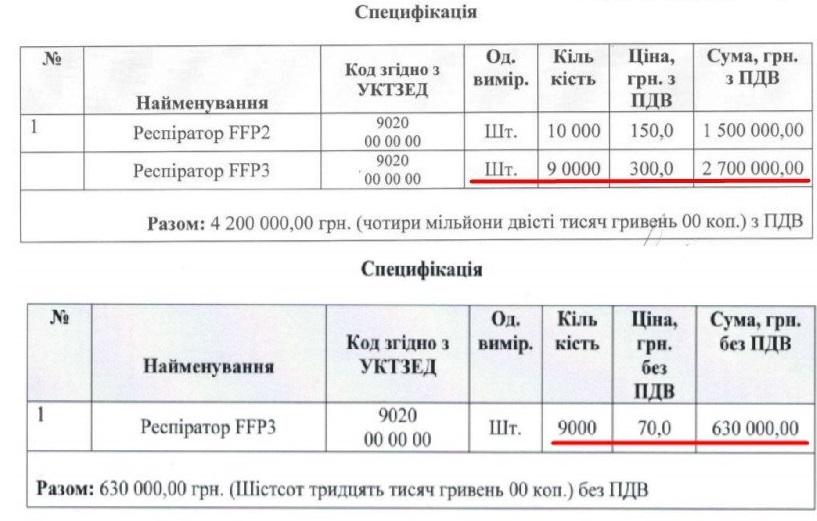 Центр збирався придбати 19 тисяч респіраторів. Із них 10 тисяч респіраторів із класом захисту FFP2 по 150 грн/шт. А ще 9 тис. одиниць – із класом захисту FFP3, як у вищезгаданій закупівлі. Однак їх ціна становила б 300 грн за штуку, що більш ніж в 4 рази дорожче.