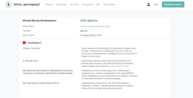 Щодо доходів нардепа, то М’ялік вказав, що за 2019 рік на посаді нардепа отримав 314 117 грн зарплати, а його дружина заробила за рік 29 099 грн.