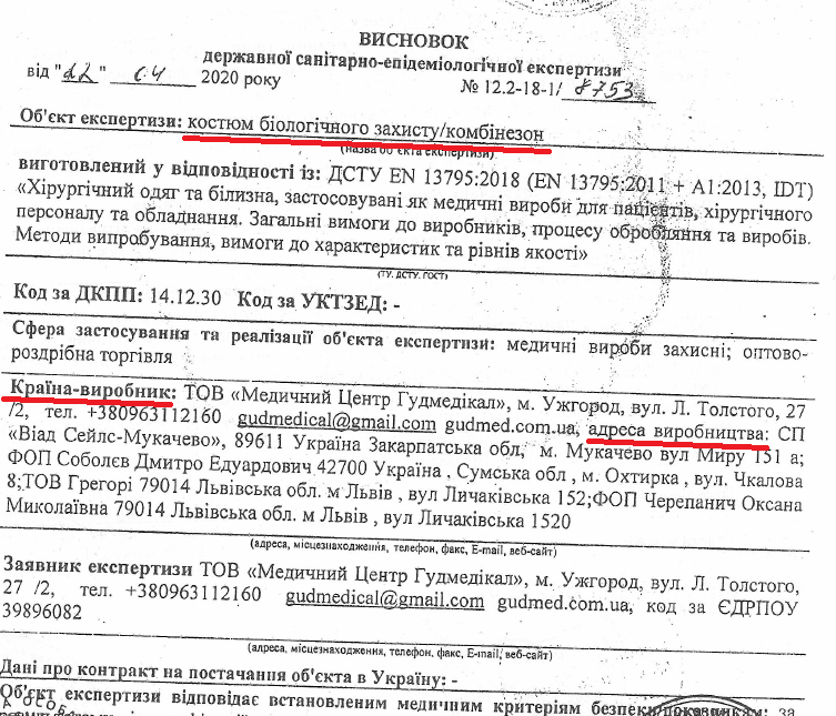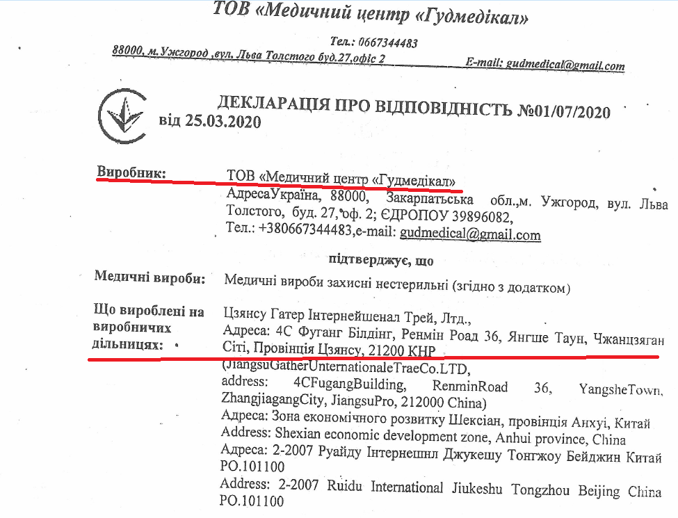 А у висновку експертизи у розділі «країна-виробник» вказано ужгородський «Гудмедікал», а як адреси виробництва фігурують контакти інших підприємців в Україні, а не Китай.