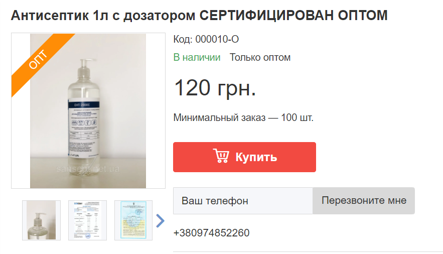 Виробником антисептика з такою назвою є харківське «Науково-виробниче підприємство «Сансепт». Їх представник телефоном повідомила, що ціна при безготівковому перерахунку для такого антисептика без дозатора при замовленні від 500 штук становитиме 105 грн, з дозатором в круглій банці – 120 грн, з дозатором в квадратній тарі – 130 грн.