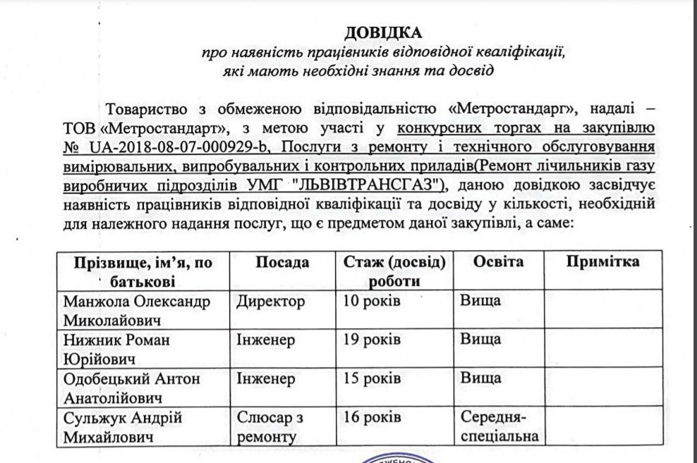 Згідно з довідкою про наявність працівників, яку «Метростандарт» подавало на інші торги, зокрема, на тендер у вересні 2018 року від «Львівтрансгазу», Роман Нижник був інженером на підприємстві. Приватним підприємцем він зареєструвався лише у листопаді 2019 року.