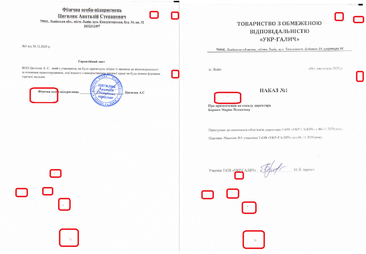 Окрім цього, ТОВ «Укр-Галич» і Анатолій Цигилик використовували спільну техніку для підготовки документів. На довідці про призначення Барнич директором та гарантійному листі Цигилика у іншій закупівлі, є однакові дефекти сканування чи друку.