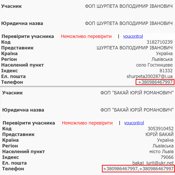 Окрім того, як свідчить модуль аналітики «Bipro. Prozorro», обидва підприємці зареєструвалися на закупівельному майданчику зі спільним номером телефону. Його в реєстрі юридичних осіб як контактний вказав учасник Володимир Шурпета.