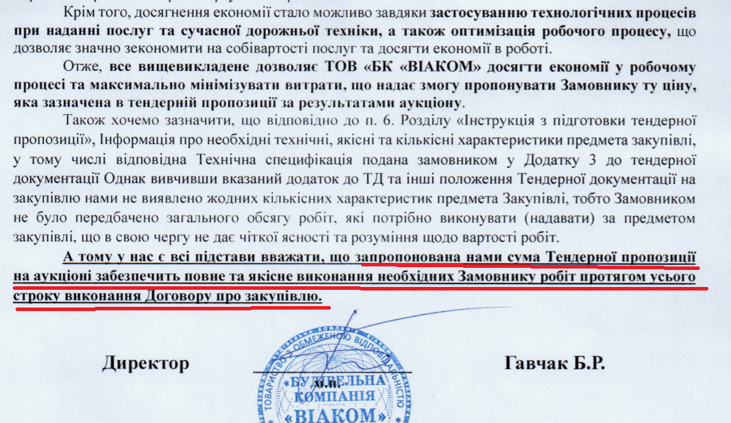 Замовник звернувся до компанії з вимогою пояснити аномально низьку вартість. Компанія повідомила, що може виконати замовлення за таку ціну, оскільки має матеріально-технічну базу у місті Дрогобичі та селі Старичі. А також через використання сучасної техніки і «оптимізації робочого процесу».