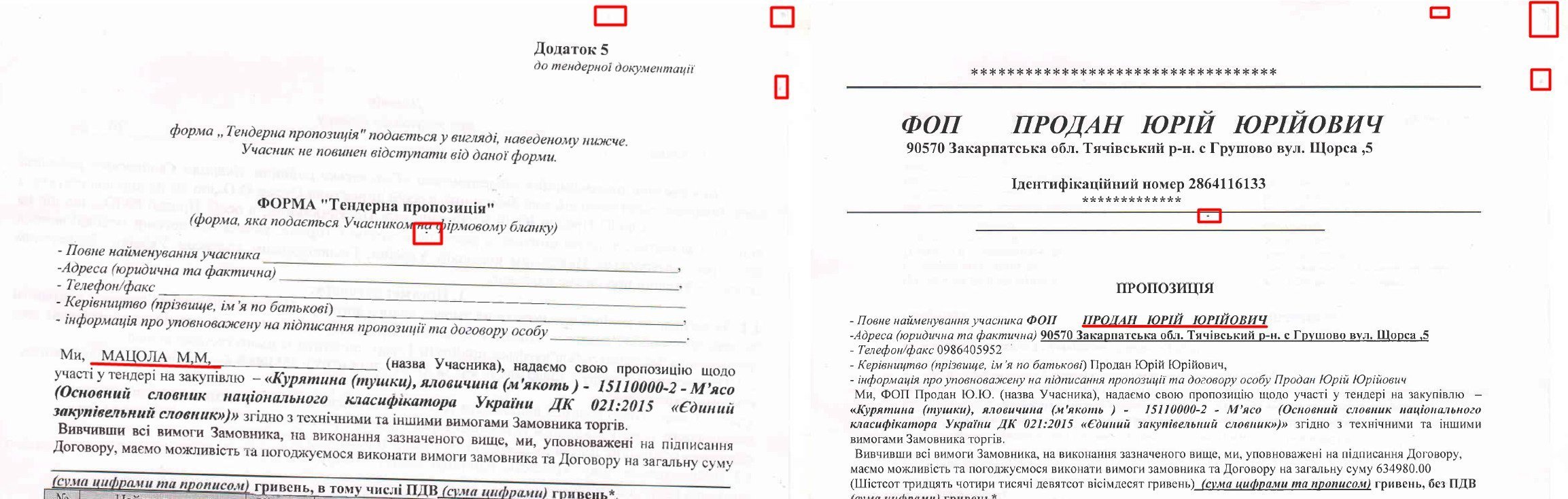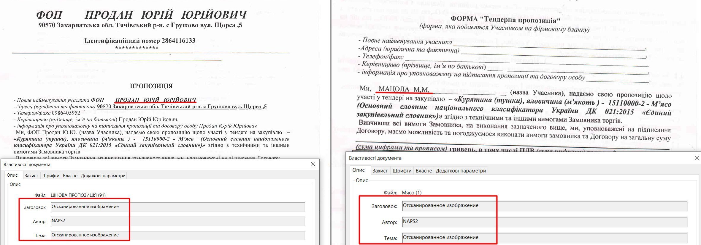 Окрім Юрія Продана участь у торгах взяв лише один приватний підприємець Михайло Мацола. В обох учасників в тендерній документації наявні однакові дефекти друку чи сканування, що свідчить про використання спільної техніки. Також у метаданих документів зазначені однакові назва, опис та автор файлів.