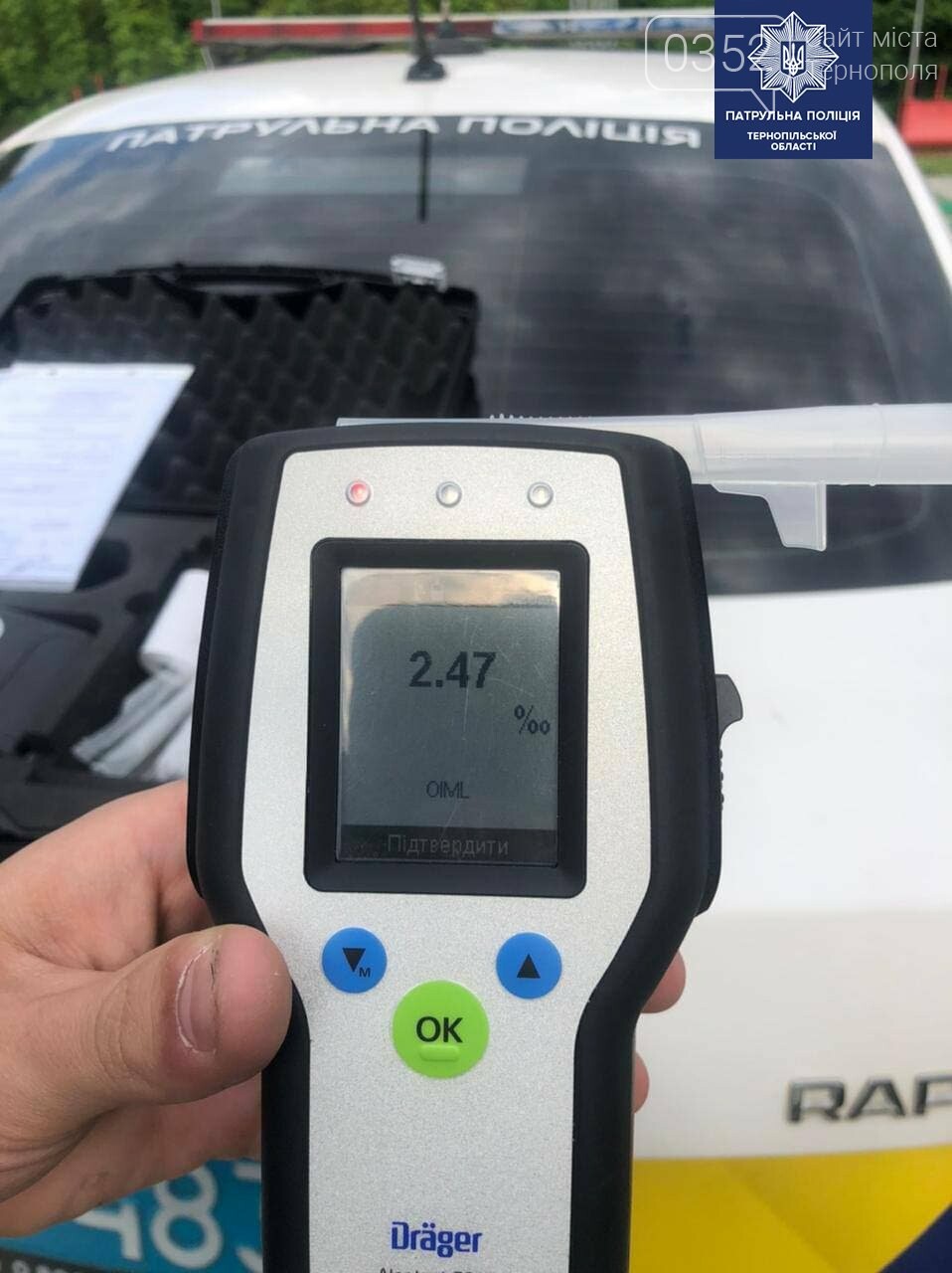 Охоронці порядку зупинили автомобіль та під час спілкування з водієм, виявили в нього ознаки алкогольно сп’яніння. Коли водія перевірили за допомогою алкотесту Драгер, прилад зафіксував 2,47 проміле алкоголю в крові водія, що суттєво перевищує допустиму законом межу, передає СТИК з посиланням на пресслужбу поліції Тернопільської області.