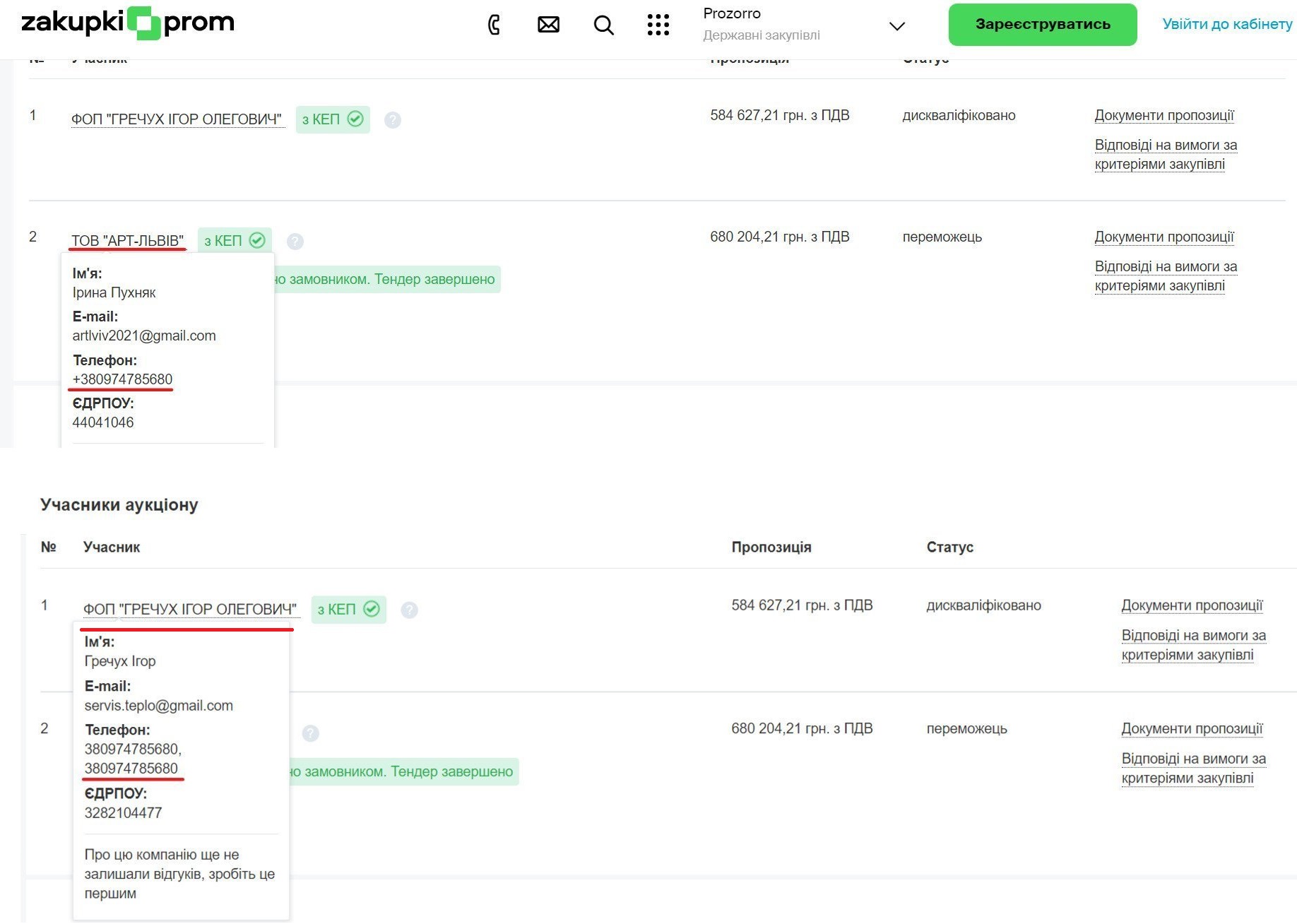 У обох учасників як контактний вказаний однаковий номер телефону.