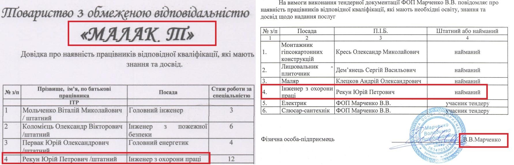 І фірма і приватний підприємець користуються послугами одного й того ж інженера з охорони праці Юрія Рекуна, про що свідчать їх довідки про працівників.