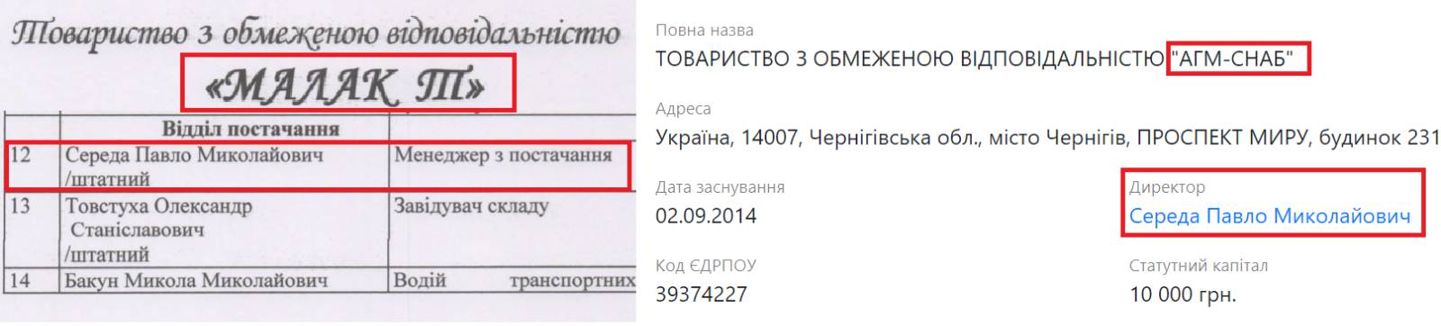 Сьогодні власником та директором «АГМ-Снаб» зазначено Павло Середу, який водночас є менеджером з постачання компанії «Малак Т». Цій ж фірмі «АГМ-Снаб» дає частину техніки, як свідчать довідки «Малак Т» про наявність обладнання.