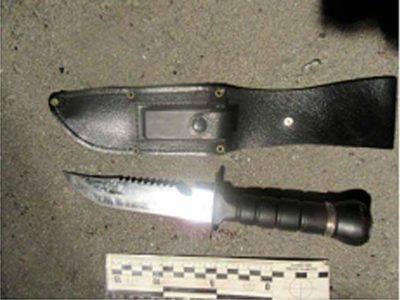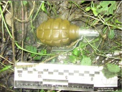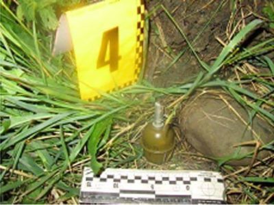 При огляді місця події виявлено предмети схожі на гранату із запалом РГД 5 та гранату із запалом Ф1, 84 набої різного калібру, 3 шт. магазинів ПМ, 1 магазин АК, споряджені патронами, та ніж.