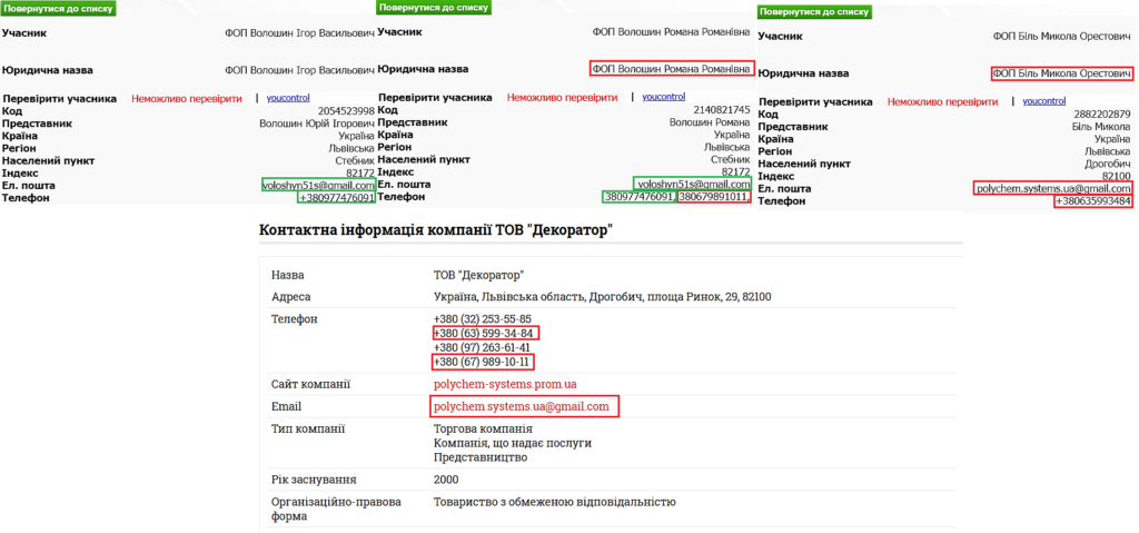 Конкурентів об’єднує дружина переможця Ігоря Волошина Романа Волошин, для якої він був довіреною особою на останніх торгах. Номери телефонів Романи Волошин та підприємця Миколи Біля, які вони використовують для Prozorro, зазначені як контактні дані на сайті ТОВ «Декоратор». Також Біль використовує для торгів електронну пошту цієї фірми. Компанія «Декоратор» належить Олегові Волошину та депутатові Дрогобицької міської ради від партії «Самопоміч» Сергію Оленичу.
