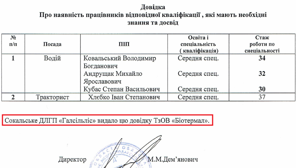 Фірми важко назвати конкурентами, оскільки вони мають спільних працівників та користуються однією технікою. Про це зазначає фірма «Біотермал» у своїй тендерній документації. Вона подала довідки про працівників та матеріально-технічну базу, видані їй сокальським лісгоспом.