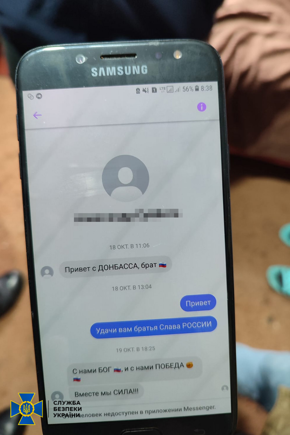 Під час обшуку СБУ виявила в телефоні агітатора переписку з російським вояком, у якій фігурант бажав агресорам удачі, називаючи їх «браттями», а також написав гасло «слава россии».