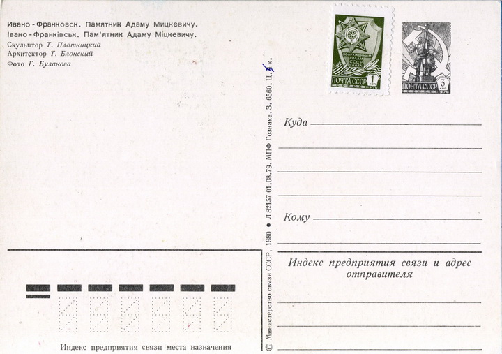 А перші «справжні» радянські поштівки, які стосувалися Франківська, з’явились лише у 1957 році. Вони були чорно-білі, виготовлялись фотографічним способом на фабриці масового фотодруку тресту «Укрфото» та мали солідний наклад у п’ять тисяч примірників. Перелік видів наступний: парк Шевченка, готель «Карпати» (тепер ресторан «Садко»), вулиця Щорса (Вітовського), медінститут і Радянська площа (Вічевий майдан). Згодом до традиційних об’єктів додалися радянські новобудови. Серед них можна побачити заводи й фабрики, які у всьому світі, м’яко кажучи, не вважаються туристичними родзинками. А от храми зникли. Виняток зробили тільки для колегіати, і то лише через те, що там розмістився музей.