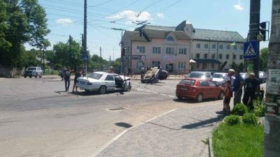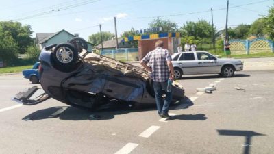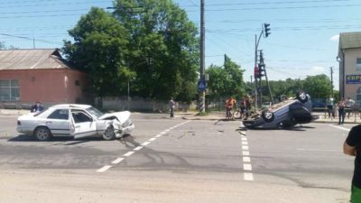 Поруч із сфітлофором легковик влетів у «Мерседес» та перекинувся.