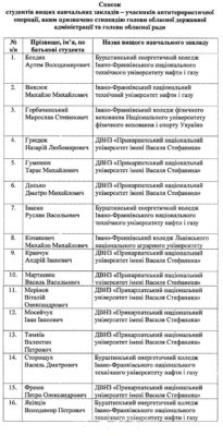 Серед переліку вищих навчальних закладів, студенти яких отримуватимуть дану стипендію, – Бурштинський енергетичний коледж Івано-Франківського національного технічного університету нафти і газу, Івано-Франківський національний технічний університет нафти і газу, Івано-Франківський коледж фізичного виховання Національного університету фізичного виховання і спорту, ДВНЗ «Прикарпатський національний університет імені Василя Стефаника», Івано-Франківський коледж Львівського національного аграрного університету.