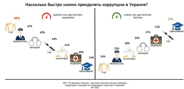 За подолання корупції громадяни дали неоптимістичні прогнози. Так, найбільш позитивно респонденти оцінюють темпи подолання корупції у сфері освіти – 37% вважає, що її можна подолати досить або дуже швидко. Втім, майже стільки ж вважають, що цей процес буде дуже повільним. А судова система завдяки своїй репутації знову потрапила на чільне рейтингу організацій, в яких корупцію перемогти буде найважче. Майже половина українців впевнені, що викорінення хабарництва буде просуватися повільно або навіть вкрай повільно.