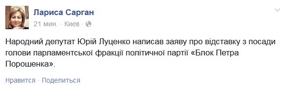 Народний депутат Юрій Луценко написав заяву про відставку з посади голови фракції "Блок Петра Порошенка". Про це повідомила його прес-секретар Лариса Сарган, пише Кореспондент.net.