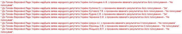 Як повідомляє Кореспондент.net. yаразі заяву про відкликання голосів подали 6 депутатів, ще двоє, навпаки, просять зарахувати свій голос "за".