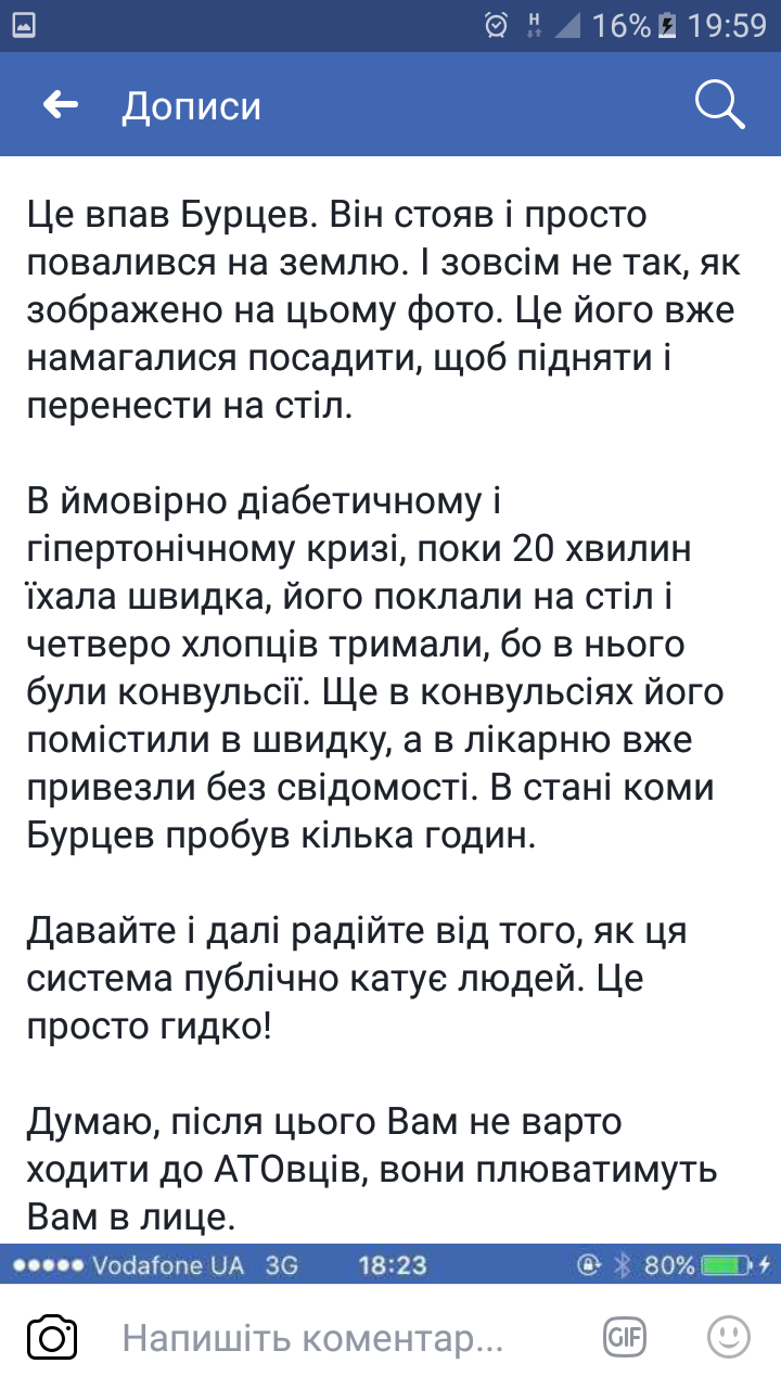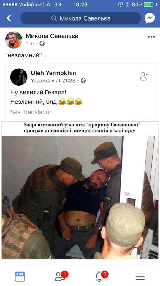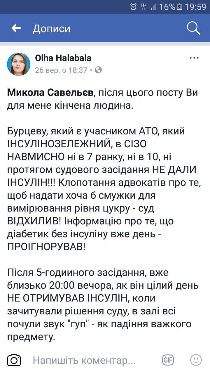 Галабалу обурило, що Микола Савельєв поширив у соцмережі скептичні та насмішливі коментарі про Олександра Бурцева, якого ув’язнили на 60 діб за участь у “прориві Саакашвілі” через кордон.