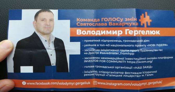 Крім того, у 84-му окрузі розповсюджуються листівки потенційного кандидата Володимира Гергелюка «Команда Голосу. Володимир Гергелюк» , якого недавно висунула партія «Голос» на своєму з’їзді.