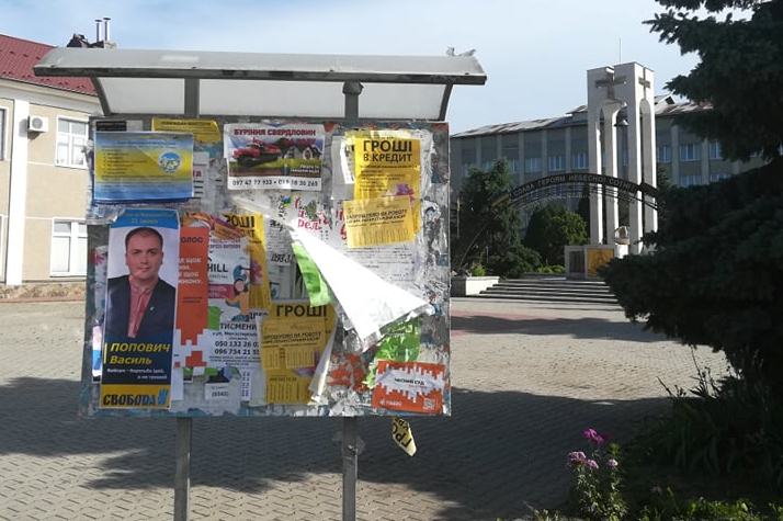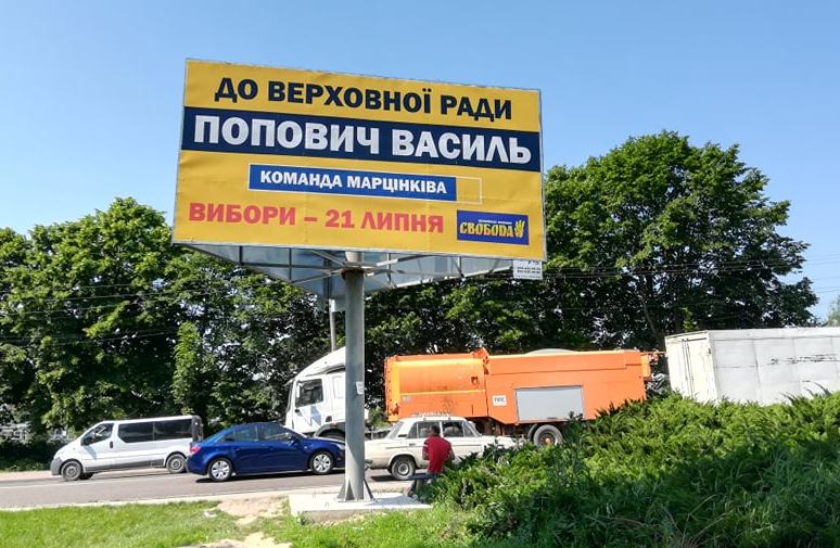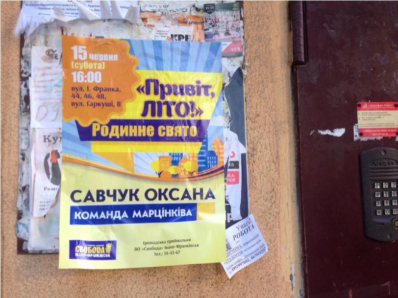 Також в області продовжується розміщення реклами потенційних кандидатів у депутати Оксани Савчук, яку з’їзд партії ВО «Свобода» висунув кандидаткою в окрузі №83 (Івано – Франківськ) та Тараса Виноградника округ №86 (Долина), якого висунула по цьому округу партія Народний Рух України. Оксана Савчук – одна з найактивніших потенційних кандидатів у плані реклами. Минулого тижня у Івано-Франківську, окрім білбордів, з’явились ще й «агітаційні куби», на яких різні більш чи менш відомі особистості позитивно висловлюються про Савчук, а також плакати з запрошенням на «Родинне свято».