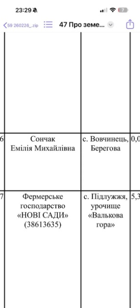 У матеріалах сесії міської ради, копії яких поширювалися громадськими активістами, фігурує прізвище Емілії Сончак серед заявників на отримання земельних ділянок для “сінокосіння і випасання худоби”.