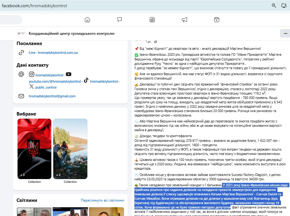 “У 2021 році Івано-Франківська міська рада прийняла рішення про надання дозволів на складання проєктів землеустрою для відведення земельних ділянок.У списку щасливців опинилися батьки Мар’яни Вершиніної – Сончак Емілія та Сончак Михайло. Вони отримали дозволи на дві ділянки у мальовничому селі Вовчинець (вул. Берегова) під будівництво та обслуговування житлового будинку, загальною площею понад 14 соток. Хоча формально це не було прямою вигодою депутатки, факт отримання значних земельних активів її найближчими родичами у той час, як вона є діючим членом міськради, який голосує за такі рішення, викликає питання щодо можливого використання службового становища”, – передає Координаційний центр громадського контролю.