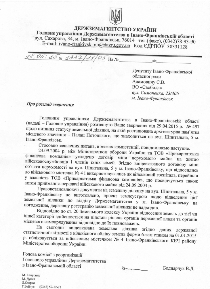 На звернення депутатів Івано-Франківської обласної ради Сергія Адамовича та Сергія Федорціва щодо правового статусу комплексу палацу Потоцького отримано відповіді з Головного управління Держземагенства в Івано-Франківській області та Відділу Держземагенства в Івано-Франківську, пише Курс.