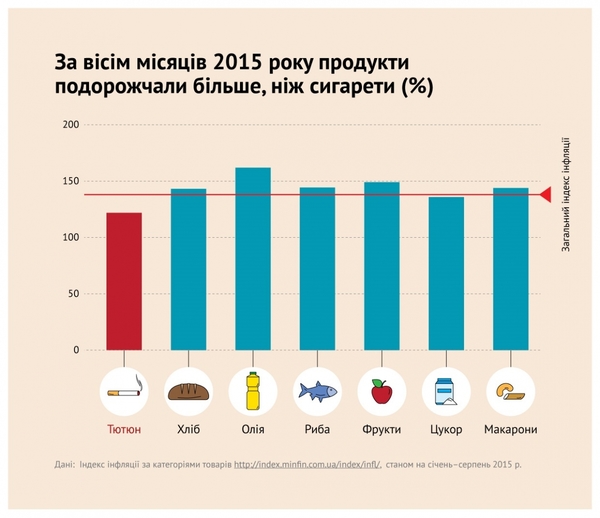 У січні-серпні 2015 р. ціни на тютюнові вироби, за даними Держстату, зросли на 22%. Таким чином, запропоноване зростання акцизів дозволить підвищити ціни на сигарети лише до очікуваного рівня інфляції в 2015 році. Якщо проаналізувати індекс споживчих цін на деякі продукти споживчого кошику, то можна побачити, що їхня ціна зростала активніше, ніж на тютюн. Індекс інфляції за деякими категоріями товарів в січні-серпні 2015 р. був такий: хліб – 143,3%, олія – 162,1%, риба – 144,5%, а на тютюн – 122%.