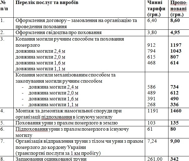 Востаннє тарифи на ритуальні послуги, пов’язані з похованням, що надає КП «Міська ритуальна служба», збільшувалися у вересні 2014 року.