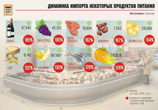 Особливо помітний відступ кризи на споживанні екзотичних фруктів. Так, завдяки загальносвітовому падінню цін на продукти харчування і зняття частини валютних обмежень для імпортерів, споживання бананів зросло на 33 відсотки, ананасів з фініками ввезли на 66 відсотків більше. Зростання імпорту цитрусових становить 26 відсотків.