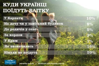 За даними дослідження, проведеного Київський міжнародний інститут соціології, не планують відпочивати влітку 59% опитаних громадян. 10% опитаних планують їхати до Карпат, 8% збираються провести літню відпустку на дачах чи у заміських будинках, 5% влітку будуть у родичів у селі, за кордон збираються 3% опитаних, до Криму поїде 1% респондентів. Ще 14% поки не визначились з місцем відпочинку, пише СТИК з посиланням на інформаційний портал «Гуцульський край».