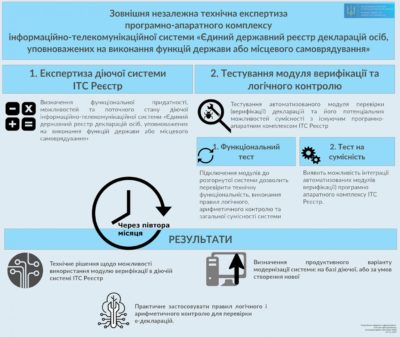 Національне агентство з питань запобігання корупції розпочинає проведення зовнішньої незалежної технічної експертизи програмно-апаратного комплексу інформаційно-телекомунікаційної системи «Єдиний державний реєстр декларацій осіб, уповноважених на виконання функцій держави або місцевого самоврядування», яка відбуватиметься двома паралельними процесами.
