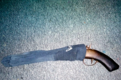 Під час проведення обшуку в його домоволодінні виявлено та вилучено: чотири металеві банки з сипучою речовиною сірого кольору, ззовні схожою на порох, два предмети циліндричної форми, схожі на димові шашки, два предмети, зовні схожі на саморобні пістолети без маркувальних позначень невідомого калібру, один з яких барабанного типу, штик-ніж, двохствольну гладкоствольну мисливську рушницю, пневматичну гвинтівку іноземного виробництва.