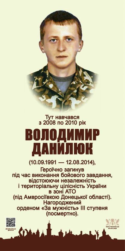 Завтра, 10 жовтня, о 10:00 на фасаді Івано-Франківського коледжу ресторанного сервісу і туризму НУХТ (за адресою вул. О.Сорохтея, 43) відбудеться відкриття та освячення пам`ятної анотаційної дошки загиблому учаснику АТО Володимиру Данилюку.