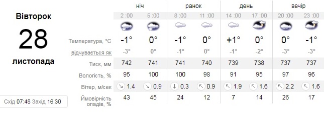 Народний прогноз погоди: 28 листопада вшановується пам’ять сповідників Гурія, Самона і Авива. У народі цей день називали Гур’євим, і відзначали: “Сніг, що випав на Гурія, аж до весни не розтане”. Ще казали: “На Гуріїв день зима з коня злізає, встає на ноги, кує сиві морози, стелить річками, озерами крижані мости, сипле з одного рукава сніг, а з іншого — іній”. Багато снігу цього дня передвіщає врожайний рік, а похмура погода — мокрий травень.