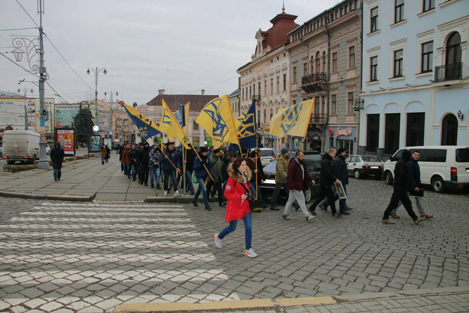 Як повідомляє прес-служба Нацкорпусу, активісти пройшлися від Центральної площі до вулиці Кобилянської, де знаходиться Румунський Культурний центр, щоб передати «подяку за співпрацю» від ФСБ Росії Василю Терицану, який відомий своєю пропутінською позицією. Але самого пана Терицана, як і всіх працівників центру, на робочому місці не було.