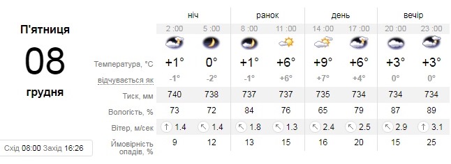 Народний прогноз погоди: 8 грудня вшановується пам’ять святого Климента, папи Римського. У народі цей день називається Климентовим: “У день святого Климента зима клин клином вибиває” — з цього часу настає пора сильних морозів: “Климент морозом у чоловіка сльозу гонить”; “Мороз насипав білих троянд”. На Климента боялись побачити в поселеннях польових мишей, оскільки їх наближення до будинків вказувало на холодну зиму.