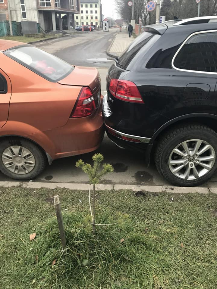 «Водійка на автомобілі (припускаєми що на Фольксваген Пасат Б5 Варіант рестайл) заїхала в Шевроле Авео в передній бампер і затисла його до бампера Фольксваген Туарега. Свідок запевняє, що авто зловмисниці на іноземних номерах.