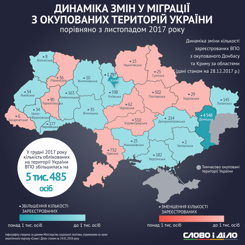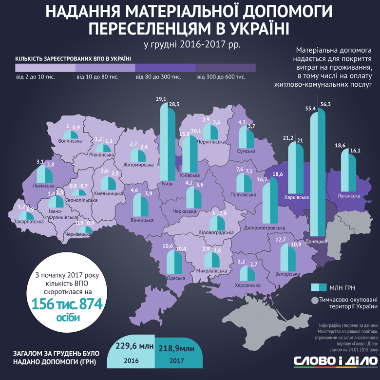 Загалом із початку 2017 року кількість переселенців в Україні знизилася на 156 тисяч 874 особи. Відповідно, скоротилася й сума матеріальної допомоги, яка надається для покриття витрат на проживання та оплату житлово-комунальних послуг. У 2016 році на це було виділено 229,6 мільйона гривень, а в 2017-му – 218,9 мільйона гривень.