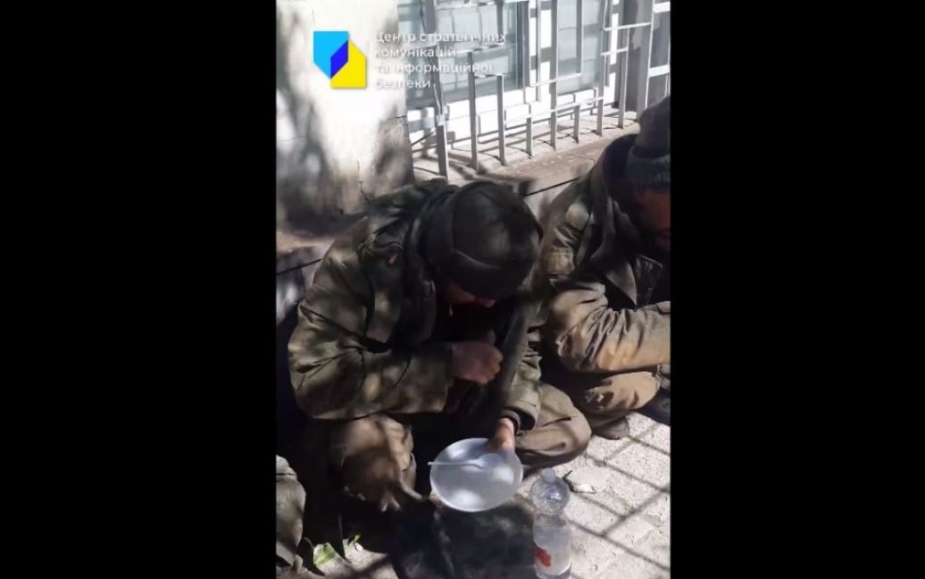На кадрах видно, як брудні і зголоднілі окупанти без належного військового спорядження, а деякі навіть без взуття, наминають за обидві щоки їжу, яку їм дали українці.