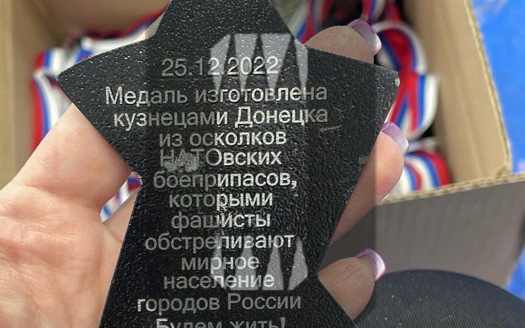 На зворотньому боці написано, що медалі “виготовлені ковалями Донецька з осколків НАТОвських боєприпасів”, якими “обстрілюють мирне населення міст Росії”. Росіяни “забули”, що Донецьк – це Україна, і його обстрілюють самі ж окупанти, звинувачуючи в цьому ЗСУ.