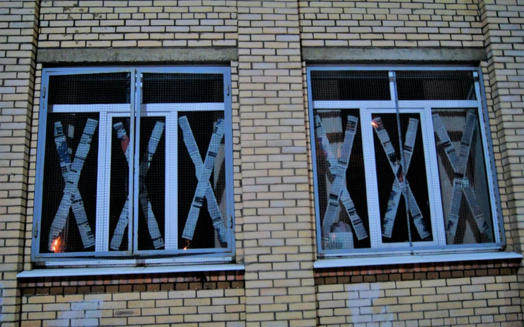 - нанести захисні смуги зі скотчу (паперу, тканини) на віконне скло для підвищення його стійкості до вибухової хвилі та зменшення кількості уламків і уникнення травмування у разі його пошкодження;