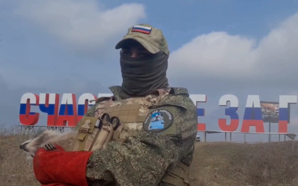 На опублікованих кадрах зафіксовано, як російський загарбник на тлі величезного напису “Щастя не за горами” вітає жінок з 8 березня, стискаючи при цьому в руках єнота, який намагається вибратися з рук окупанта.
